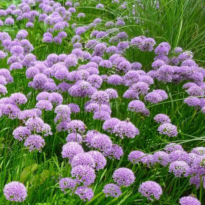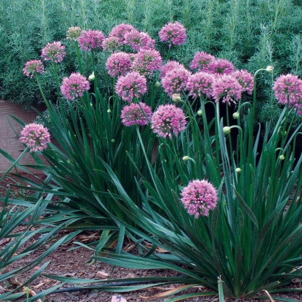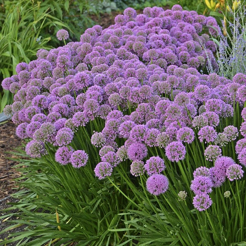 Allium Millenium is one of the very best ornamental onions. Unlike spring-blooming Allium bulbs, this hybrid Allium blooms in mid-summer with large globes of rose-pink flowers. Mature plants have dozens of globes covering this perennial plant. Attractive, shiny deep-green grassy foliage is very ornamental. Perennial Plant Association 2018 Plant of The Year.