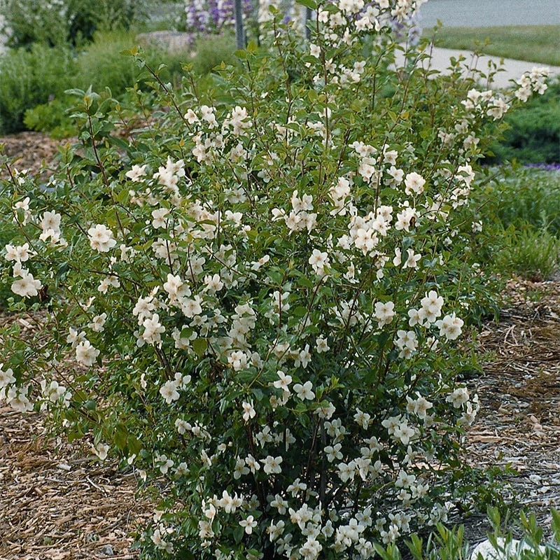 6-9’ tall x 5-8’ wide. Philadelphus lewisii ‘Cheyenne® PWYO1S’ (Mock Orange) is an award-winning native shrub grown for its amazing display of large, white fragrant late spring flowers. Cheyenne® is a Plant Select® winner chosen for its exceptional toughness and adaptability to a wide range of growing conditions. Growing in most any type of soil, including clay, this large growing shrub enjoys both sun and partial shade. Late spring blooms and fragrance make this plant especially bee-friendly. Recommended companions include other shrubs like Caryopteris and large ornamental grasses like Panicum (Prairie switchgrass).