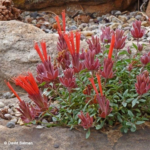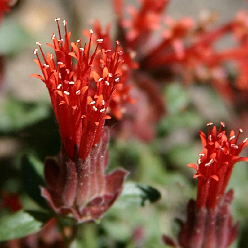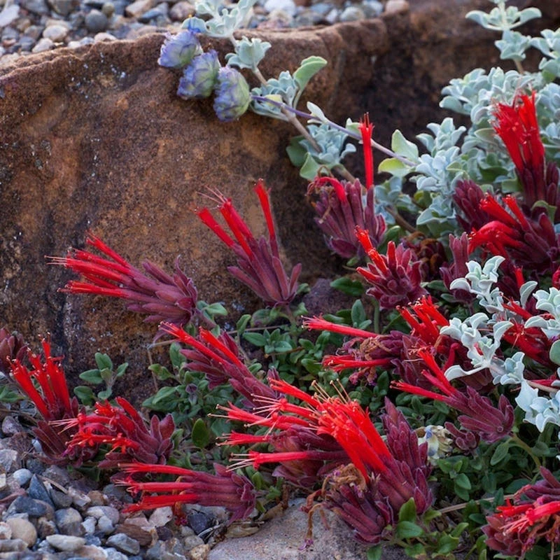A dazzling selection of this California native wildflower species, Monardella macrantha ‘Marian Sampson’ (Hummingbird Coyote Mint) has clusters of brilliant red, tubular flowers held over low mats of dark green, shiny leaves. Blooming in late spring it is certain to attract hummingbirds. Drought resistant/drought tolerant plant (xeric).