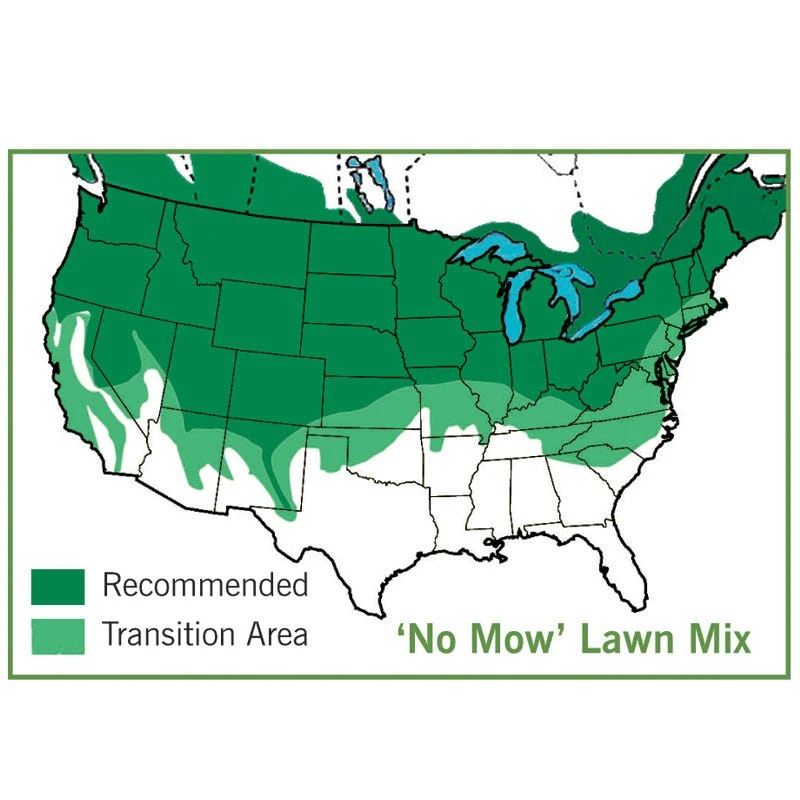 This mix is suited for a wide range of the United States and is best for regions in the cooler average-rainfall areas of the upper Midwest, northeastern US, and higher elevations of the Intermountain West (See recommended planting area map in product photos). In the Western US, this cool season grass is better suited for use at elevations above 6,000-7,000 feet, compared to warm season native grasses (like Blue Grama and Buffalo Grass). No Mow is best sown in March through early May, or late August through September. This grass grows best at and around 70°F.