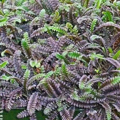 A tight growing groundcover, Leptinella squalida ‘Platt’s Black’ has ornamental, ferny foliage with nearly-black highlights to the leaves.