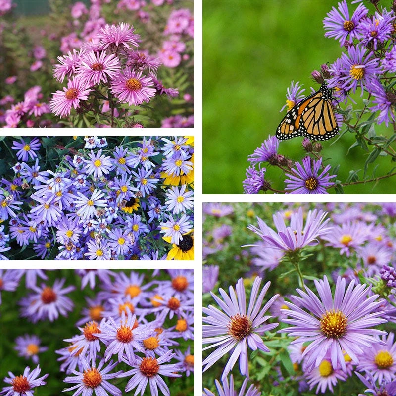 Become a pollinator hero with our Superstar Aster Collection. Asters (Symphyotrichum) are versatile and easy to grow in perennial gardens and naturalized meadow-style plantings. As a nectar-and-pollen-rich food source pollinators, they provide some of the season’s last food for pollinators. Bluebird Aster showers the garden with sky blue flowers. Create a spectacular Aster border by planting the taller plants in the back, graduating to mid-size with the short growers along the front. Mix in some autumn-flowering Salvia, Echinacea (Coneflower) Coreopsis, and Monarda (Bee Balm) for an easy-care, colorful, long-blooming garden. Plant in average soil in a sunny location with consistent watering. As they establish, they will become more drought tolerant. Divide in spring every 3 years to reinvigorate the plants.